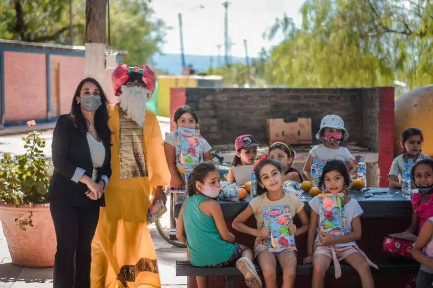 La intendenta Romina Rosas junto a los míticos personajes visitaron algunos barrios para entregar alegria a los pequeños de las familias.