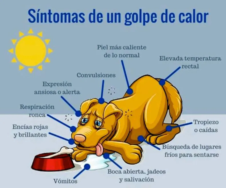Los síntomas de un golpe de calor en animales son dificultad en los movimientos, respiración forzada, tambaleo, sialorrea o babeo, fiebre y la lengua y las mucosas azules.