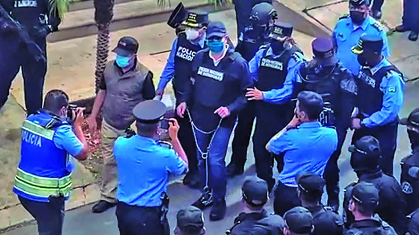 Se entregó el expresidente hondureño Hernández, cuya extradición pidió Estados Unidos. Vestido de azul, Hernández salió de su vivienda e inmediatamente policías le colocaron un chaleco antibalas y lo esposaron de pies y manos para trasladarlo a una unidad policial para ser presentado posteriormente ante el juez Edwoin Ortez.