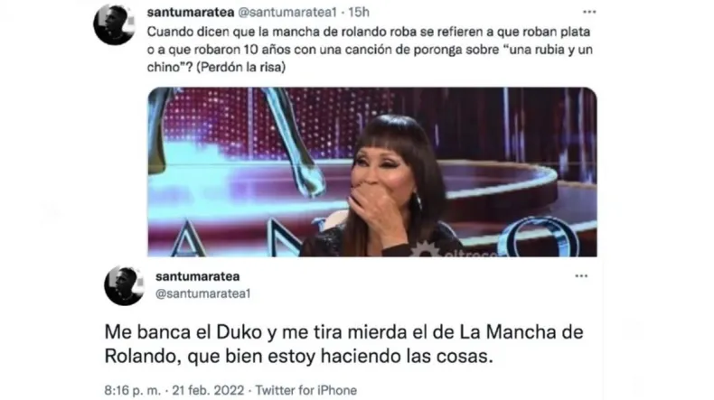 Maratea también acusó a la banda de formar parte de operaciones de desprestigio: "Me acaban de llegar un montón de cosas de La Mancha de Rolando y cómo se mantiene, por algún motivo le dicen La Mancha de robando... Nada el tipo es parte de un grupete que se le paga por hablar mal de uno o de otro, en este caso para hablar mal de mí". Santi cerró su descargo revelando la manera en la que respondería al artista si este intenta llevar esta disputa a lo legal: "Lo que más me gustaría es que el de La Mancha de Rolando me mande una carta documento diciendo que dañé su imagen y yo le diría 'qué imagen, si no te conocé nadie, boludo'".