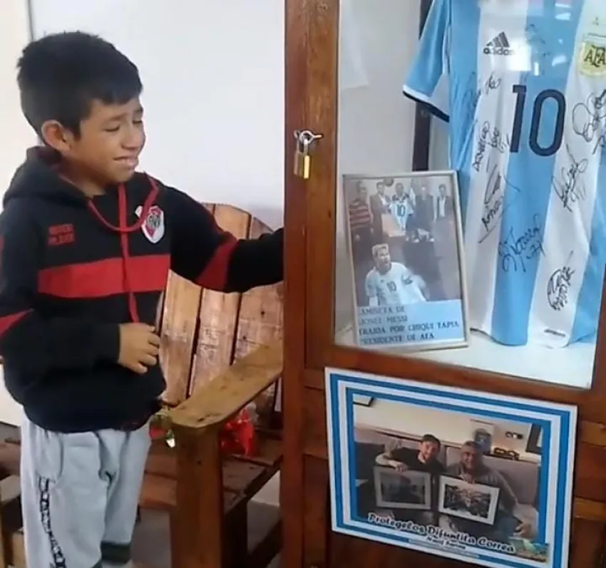 Arturo, es un pequeño sanjuanino que no pudo contener las lágrimas de emoción al ver la camiseta de Messi en la Difunta Correra.