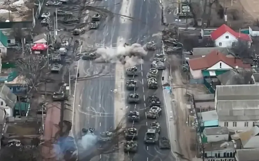 Imágenes impactantes tomadas desde un drone muestran el momento en el que el convoy es emboscado, atacado y repelido cuando avanzaba hacia Kiev.