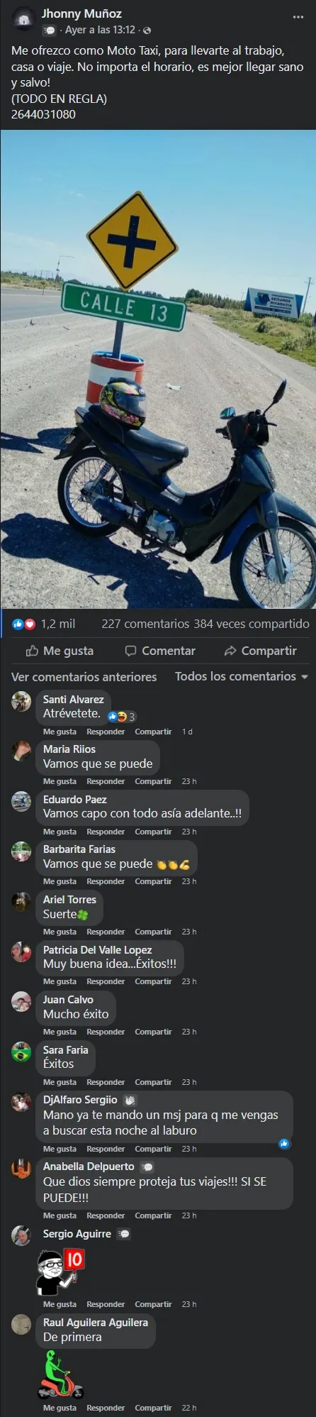 "Me ofrezco como Moto Taxi, para llevarte al trabajo, casa o viaje. No importa el horario, es mejor llegar sano y salvo", publicó Muñóz en un grupo de compra venta (TODO EN REGLA) , agregó.