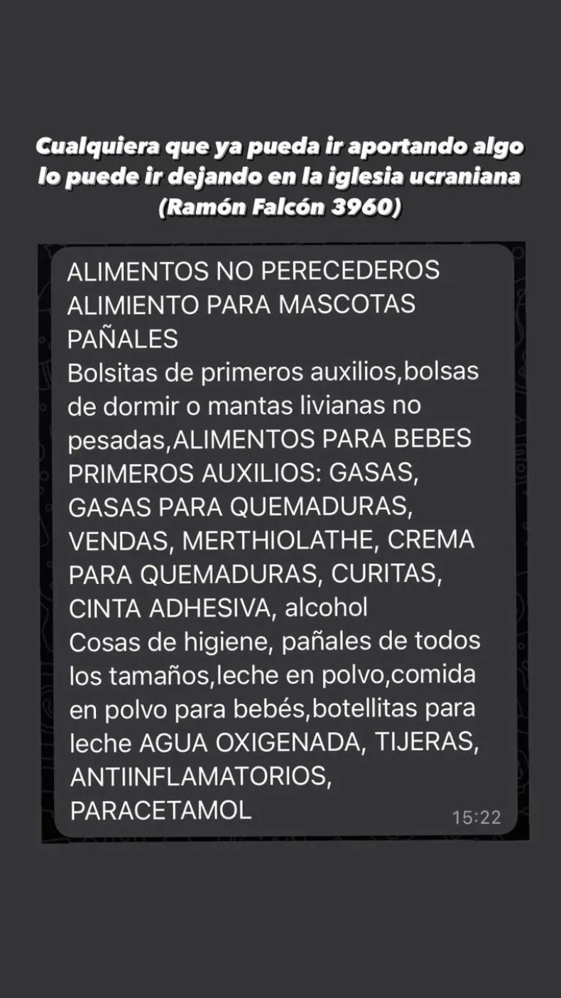 "Cualquiera que quiera ir aportando algo, puede dejarlo en la iglesia ucraniana (Ramón Falcóm 3960)", compartió Maratea en sus historias.