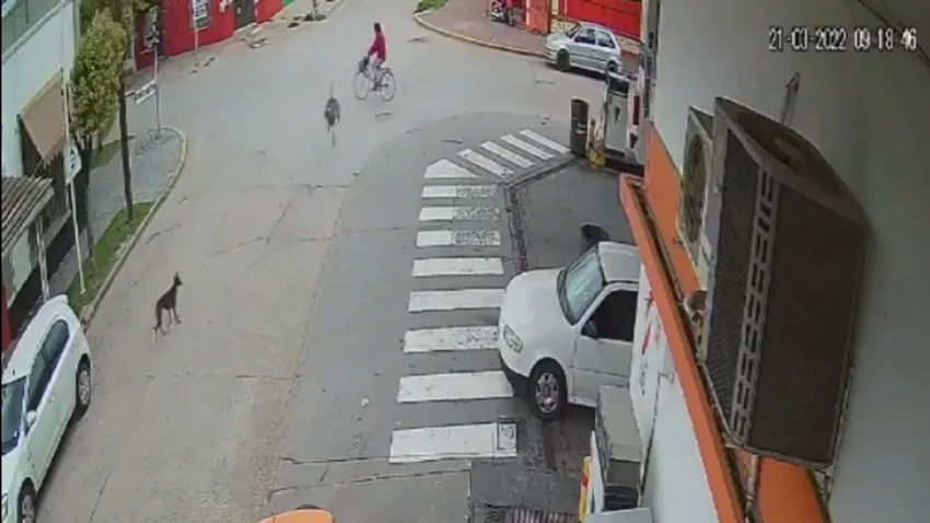 El video muestra a la ciclista acercarse a la esquina frente a la estación de servicio de la ciudad, mientras que por la calle a cruzar el animal es perseguido por algunos perros de las casas cercanas. Al venir de contramano, el ñandú sorprendió a la mujer y la embistió, derribándola al piso y cayendo también como consecuencia.