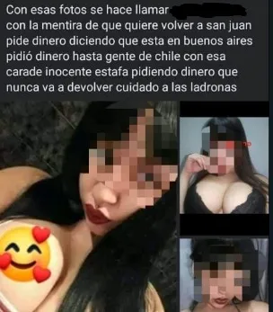 "Con esas fotitos se hace llamar ....", indicó un usuario de Facebook. Alegó que pide dinero, con "la mentira de que quiere volver a San Juan", diciendo que está en Buenos Aires.