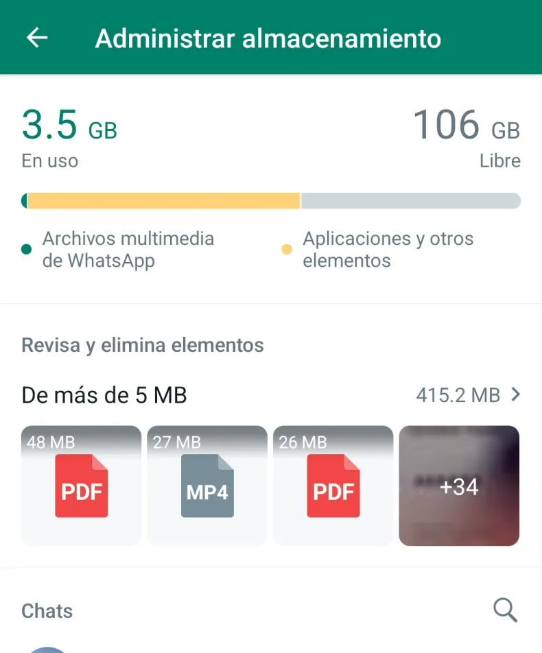 Al ingresar allí no sólo se verá el espacio disponible sino se tendrá acceso a un listado con la cantidad de datos que se han compartido en cada chat.
