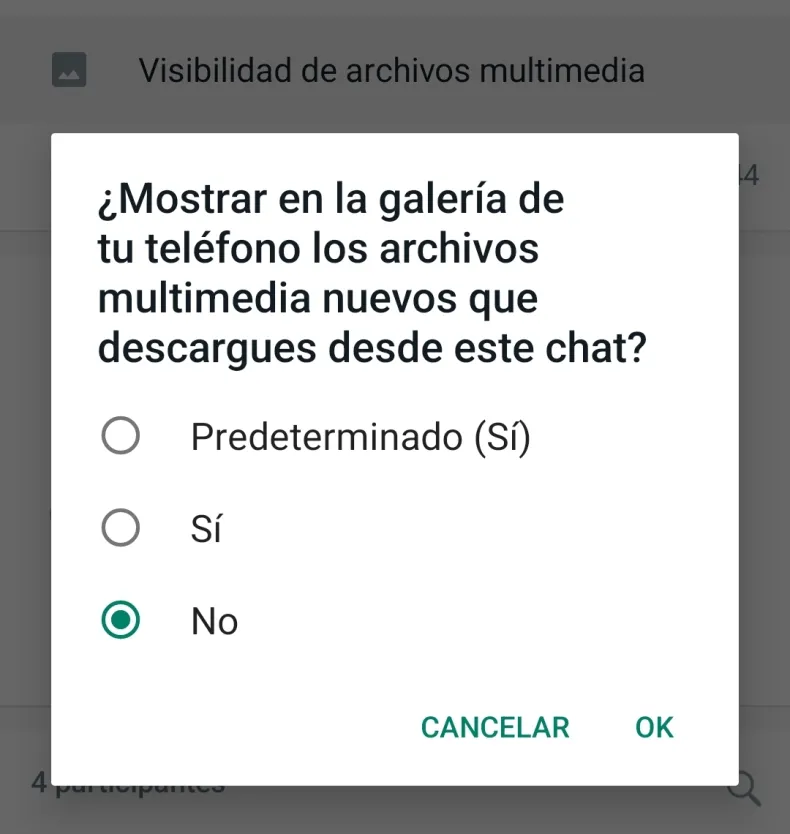 Para configurar esto hay que ir hasta Ajustes/Chats y allí desactivar la opción que dice Visibilidad de archivos multimedia. Porque si esta opción está activada todas las fotos y videos se bajarán al móvil, y se verán en la galería de imágenes.