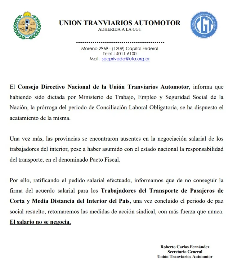 "Una vez más, las provincias se encontraron ausentes en la negociación salarial de los trabajadores del interior, pese a haber asumido con el estado nacional la responsabilidad del transporte, en el denominado Pacto Fiscal", reza el comunicado de la UTA.