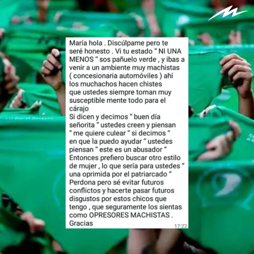 "María, hola. Disculpame, pero te seré honesto. Vi tu estado "Ni una menos", sos pañuelo verde (sic) e ibas a venir a un ambiente muy machista (concesionaria de autos).