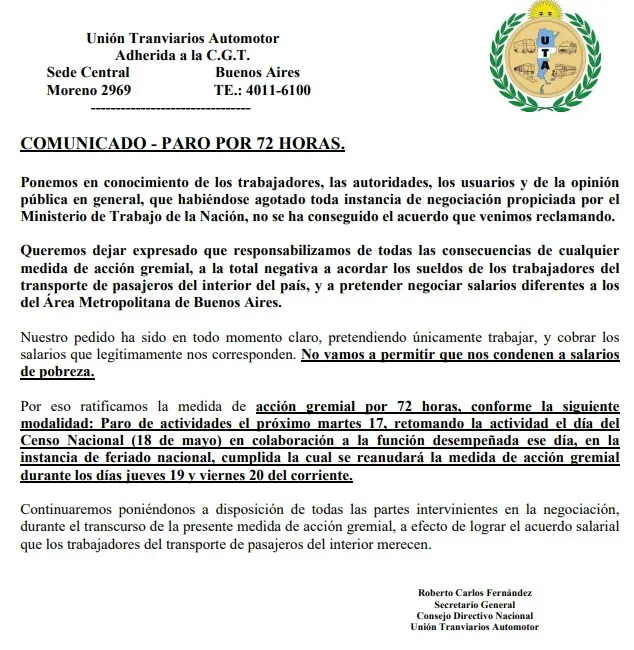 "Ponemos en conocimiento de los trabajadores, las autoridades, los usuarios y de la opiniónpública en general, que habiéndose agotado toda instancia de negociación propiciada por elMinisterio de Trabajo de la Nación, no se ha conseguido el acuerdo que venimos reclamando", indica el comunicado de la UTA, publicado esta tarde, tras la reunión paritaria.