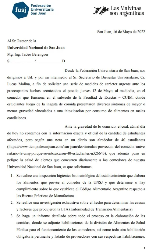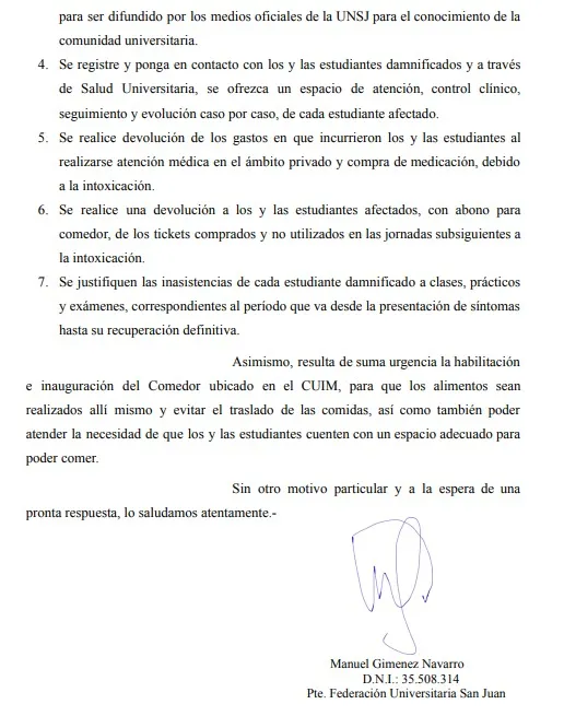 La Federación Universitaria, en representación de los alumnos afectados, sostienen que hasta este lunes aún no tienen información oficial y exacta de cuantas personas se intoxicaron a raíz de la situación. Por este motivo, solicitaron en carácter urgente a Molina, una serie de puntos a tener en cuenta para el mejor funcionamiento del lugar y poder determinar que sucedió y de quien es la responsabilidad.