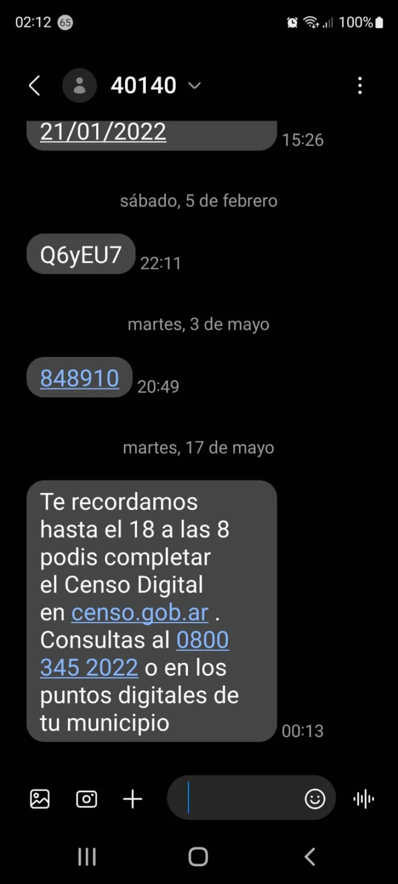 El mensaje en cuestión proviene del numero 40140 y textualmente dice: