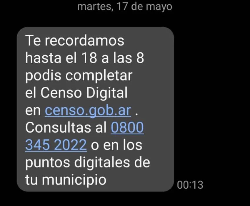Mirá un mensaje del Censo con error. Muchas sanjuaninos están recibiendo un mensaje en el que se informó hasta cuando hay tiempo para realizar el censo en forma virtual.