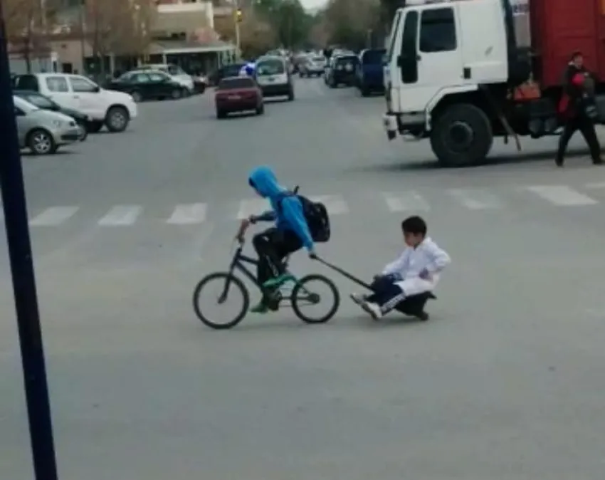 Dos niños iban transportándose de una forma muy peculiar, si bien no se puede apreciar la edad de los chicos, se nota que uno es más grande que el otro. El mayor iba en una bicicleta llevando al menor.