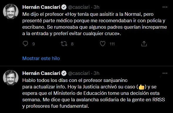 En otro psoteo había dicho anteriormente que: "Hablo todos los días con el profesor sanjuanino para actualizar info. Hoy la Justicia archivó su caso (👍) y se espera que el Ministerio de Educación tome una decisión esta semana. Me dice que la avalancha solidaria de la gente en RRSS y profesores fue fundamental".