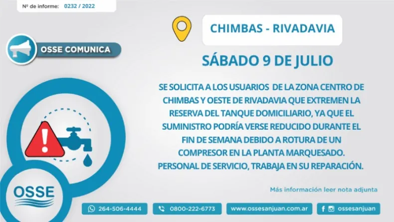 En la jornada de este sábado 9 de julio se detectó una rotura de un compresor que interviene en el proceso de potabilización del agua en el establecimiento Potabilizador Marquesado.
