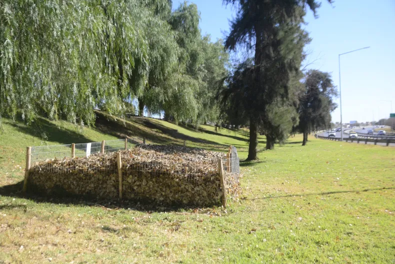 En la avenida de Circunvalación unas estructuras llenas de hojas llaman la atención de todos los que transitan por allí. Se trata de las composteras que se instalaron para un moderno método de generar en el espacio verde, un material orgánico que pueda ser utilizada en el mismo lugar para relleno o recuperación.
