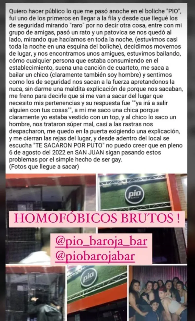 También contó que "me freno para decirle que si me van a sacar del lugar que necesito mis pertenencias y su respuesta fue ""ya irá a salir alguien con tus cosas"", a mí me saco una chica porque claramente yo estaba vestido con un top, y al chico lo saco un hombre, nos trataron súper mal, casi a las rastras nos despacharon, me quedo en la puerta exigiendo una explicación, y me cierran las rejas del lugar, y desde adentro del local se escucha "Te sacaron por puto" no puedo creer que en pleno 6 de agosto del 2022 en SAN JUAN sigan pasando estos problemas por el simple hecho de ser gay".