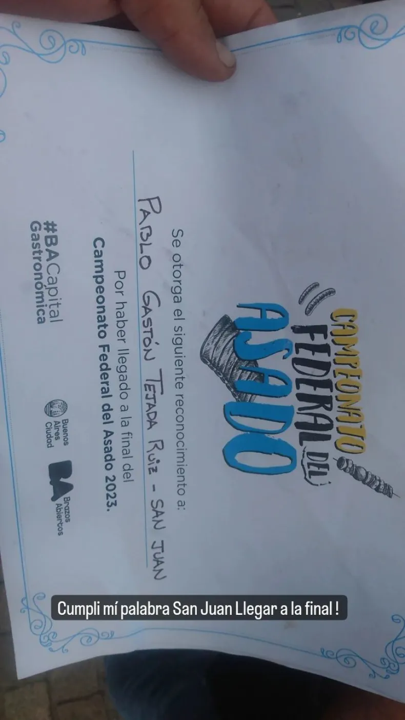 Para Pablo Tejada Ruiz, originario de Jáchal y de 35 años de edad, haber llegado a la final es un gran logro. Desde su infancia ha estado vinculado con el mundo de la gastronomía y ya ha ganado en dos ocasiones el campeonato del asado en San Martín.