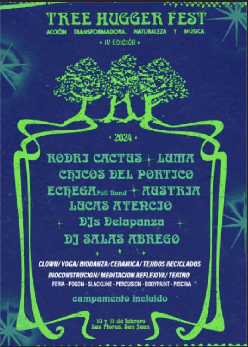 Se trata del "Tree Hugger Fest"," el festival de los Abrazarboles", que se realizará el fin de semana de Carnaval, en Las Flores, Iglesia.