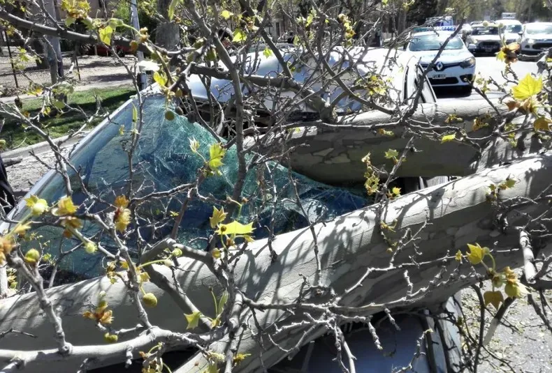 Ante el impacto fuerte del camión contra el ejemplar, una rama de importante magnitud ayó encima, impactando en el parabrisas y en el techo del auto.