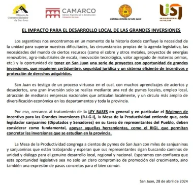 "Por eso, cercanos al tratamiento de la LEY BASES en general y en particular el Régimen de Incentivo para las Grandes Inversiones (R.I.G.I), la Mesa de la Productividad entiende que, cada legislador sanjuanino (Diputados y Senadores) en su tarea de representantes del Pueblo, deben considerar como fundamental, apoyar aquellas herramientas, como el RIGI, que permitan concretar las inversiones que se estudian en la provincia", indica.
