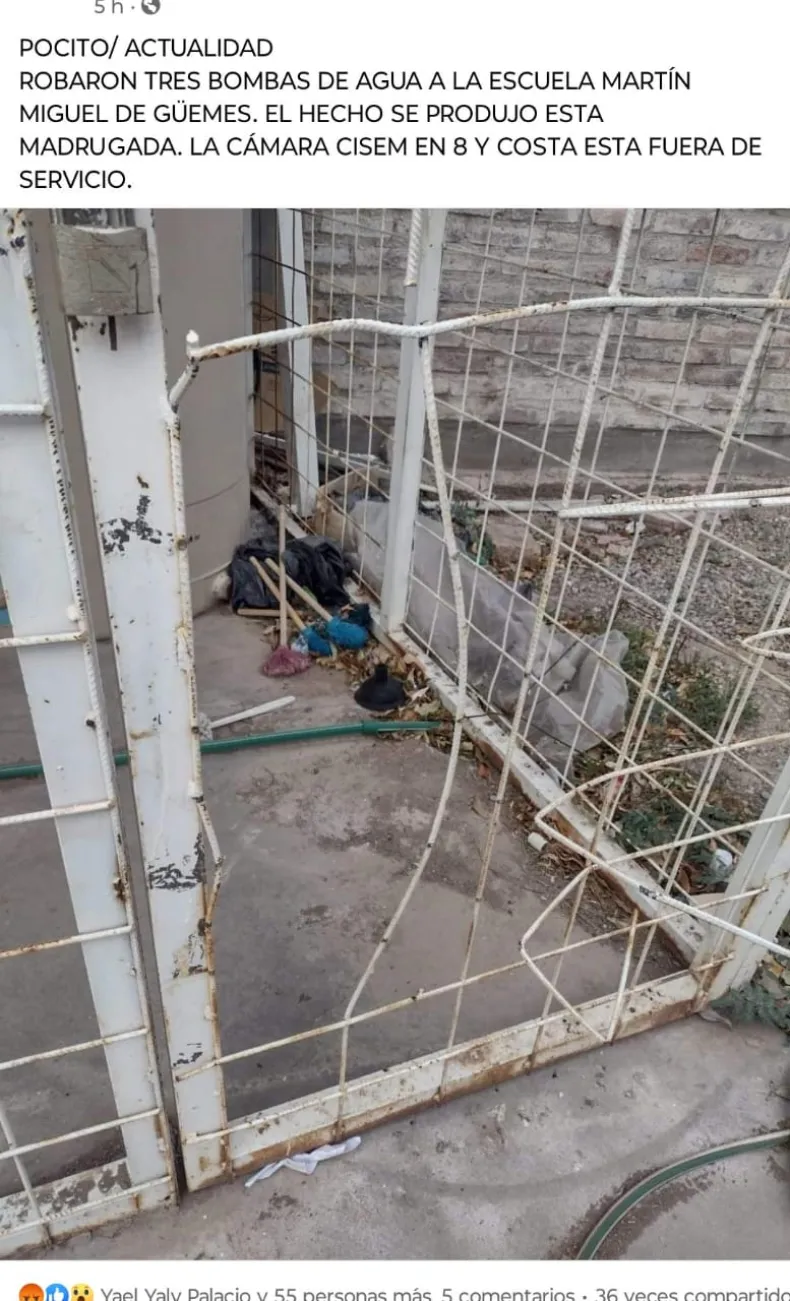 Al parecer, las autoridades de la escuela junto con el personal de maestranza (porteros) descubrieron el robo a primera hora de la mañana de hoy, cuando fueron a iniciar sus actividades, por lo que debieron comunicar, lamentablemente, la situación a la supervisora primero y al mismo tiempo al ministerio sobre el robo de tres bombas de agua, dejando sin servicio de agua potable al establecimiento y por ende la suspensión obligada de las actividades.