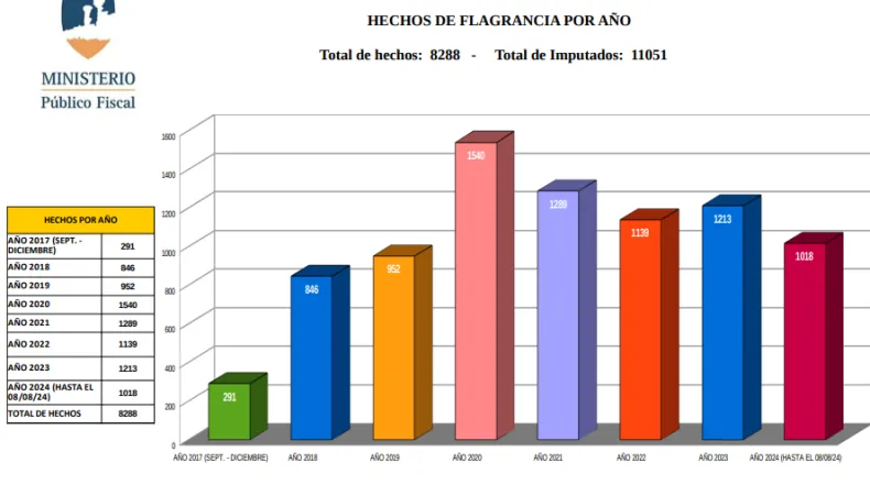 Desde su inicio en septiembre de 2017, el sistema de flagrancia ha registrado un total de 8.288 casos, con un aumento notable en los últimos años. En 2017, solo se reportaron 291 hechos, mientras que en 2020 se alcanzó un pico con 1.540 casos. Aunque en 2021 y 2022 se observó una ligera disminución, con 1.289 y 1.139 hechos respectivamente, en 2023 la cifra volvió a crecer a 1.213. Hasta agosto de 2024, se han registrado 1.018 casos, lo que indica una posible estabilización en las cifras anuales.