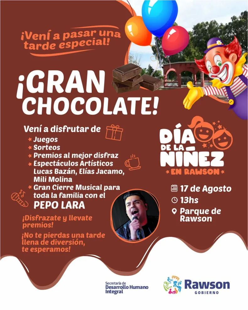 La Municipalidad de la Ciudad de Rawson, a través de la Secretaría de Desarrollo Humano Integral, invita a todas las familias a participar del gran festejo del Día de la Niñez que se llevará a cabo este sábado 17 de agosto en el parque departamental, Lemos entre Boulevard Sarmiento y Dr. Ortega.