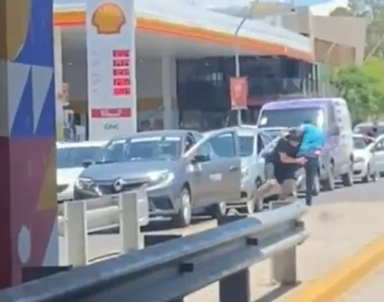 Los bocinazos de otros conductores, que exigían avanzar, sumaron estrés al incidente, generando desconcierto y malestar entre quienes transitaban por el lugar. Aunque no se conocen las identidades de los involucrados ni los motivos que originaron la pelea, las imágenes reflejan claramente cómo el enfrentamiento afectó la circulación.