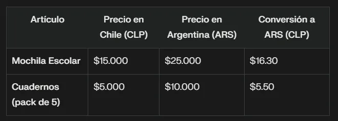 Con el inicio del ciclo escolar, muchos padres buscan útiles escolares a buen precio, y aquí también se observan diferencias significativas entre Chile y Argentina. En Chile, una mochila escolar puede costar alrededor de $15.000 CLP, mientras que en Argentina el mismo artículo podría costar hasta $25.000 ARS.