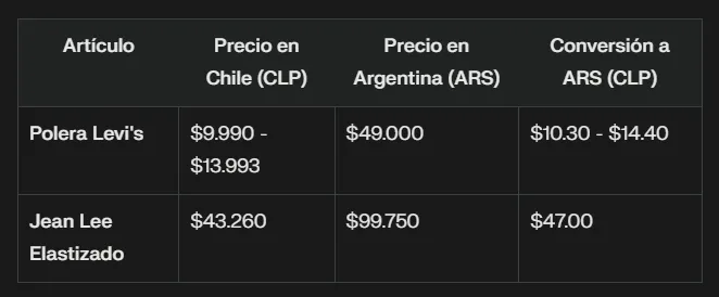 La ropa para niños también presenta una gran diferencia de precios entre ambos países. En Chile, marcas reconocidas como Levi"s y Lee ofrecen prendas a precios más accesibles que en Argentina. Por ejemplo, una polera de Levi"s puede costar entre $9.990 y $13.993 CLP en Falabella, mientras que el mismo artículo podría llegar a costar hasta $49.000 ARS en Argentina.