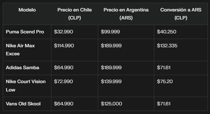 Las zapatillas son uno de los artículos más buscados por los argentinos que viajan a Chile. Tiendas como Falabella,Ripley y Paris ofrecen una amplia gama de modelos a precios significativamente más bajos que en Argentina. Por ejemplo, el modelo Puma Scend Pro se encuentra a $32.990 CLP en Falabella, mientras que en Argentina el mismo modelo puede costar hasta $99.999 ARS. Esta diferencia de precios es un atractivo importante para quienes buscan renovar su calzado deportivo.
