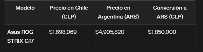La tecnología es otro sector donde los argentinos pueden encontrar precios más bajos al comprar en Chile, especialmente para computadoras portátiles y otros dispositivos electrónicos. Por ejemplo, la computadora portátil Asus ROG STRIX G17 está disponible por aproximadamente $1,698,069 CLP en tiendas chilenas, lo que representa un ahorro significativo comparado con los precios argentinos.