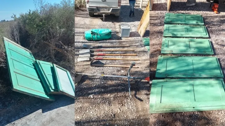 Entre los objetos recuperados hay dos puertas de madera marrón, cinco hojas de ventanas de madera verde, una carpa de camión, un horno eléctrico gris, cuatro palas, una anchada y una máquina bordeadora. Todos los elementos fueron trasladados hasta la sede policial, donde fueron reconocidos por el dueño de la finca.