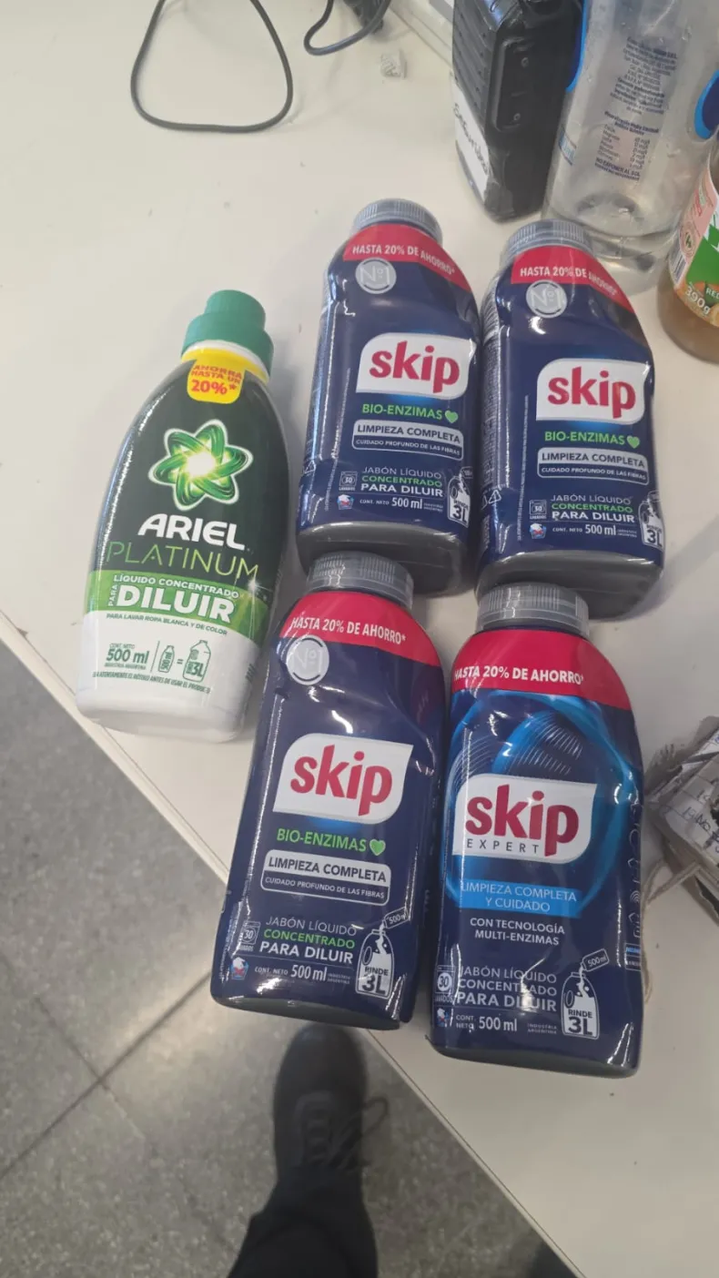Al momento de intentar retirarse del establecimiento, el personal de seguridad solicitó a la pareja que exhibieran sus mochilas de manera voluntaria. Ante esta situación, la mujer se ofuscó y extrajo de su mochila cuatro envases de jabón líquido concentrado marca SKIP y un envase de jabón líquido concentrado marca ARIEL.