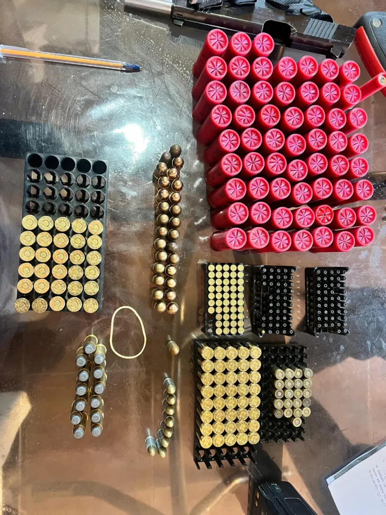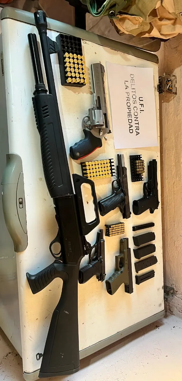 Entre las armas secuestradas figuran, por ejemplo: Una pistola Bersa 22, una pistola Glock 9.mm, una pistola semiautomática cal 45 mm, una revolver cal 44 Magnum, una Escopeta Cal 12 marca Escort y una Pistola CO2 4,5 (a gas) y como así también una gran cantidad de municiones cal 12, 9 mm y 22.