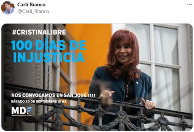 Minutos después del inicio de la convocatoria, la expresidenta salió a su balcón para saludar y arengar a los manifestantes. Posteriormente, a través de sus redes sociales, publicó un mensaje de agradecimiento: "Gracias por estar siempre".