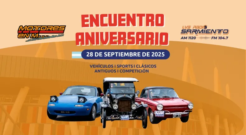 Este domingo 28 de septiembre, en el sector de estacionamiento del Velódromo Vicente Chancay, se reunirán distintos tipos de vehículos en el denominado "Encuentro Aniversario", relacionado con la celebración de LV5 Radio Sarmiento, conmemorando su primer centenario como emisora de radio en San Juan junto a un programa emblemático de la emisora: Motores en Marcha y sus 42 años en la radio; todo con el apoyo del Gobierno de San Juan, a través del Ministerio de Turismo, Cultura y Deporte.