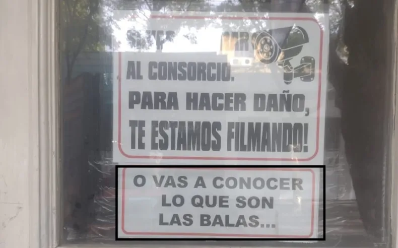 En el hall del edificio, situado sobre calle Laprida antes de General Acha, colocaron un cartel con un mensaje claro dirigido a posibles delincuentes: "Si vas a entrar al consorcio para hacer daño, te estamos filmando o vas a conocer lo que son las balas", escrito en letras grandes y bien visibles para todos los que ingresan.