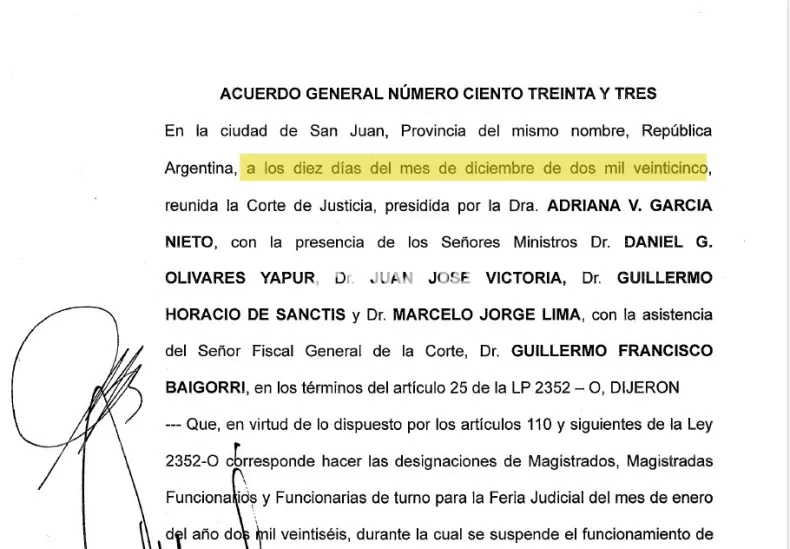 Ese medio tuvo acceso a la Acordada N.º 133, que regula el funcionamiento de la Feria Judicial de enero de 2026, y tiene fecha del 10 de diciembre de 2025.