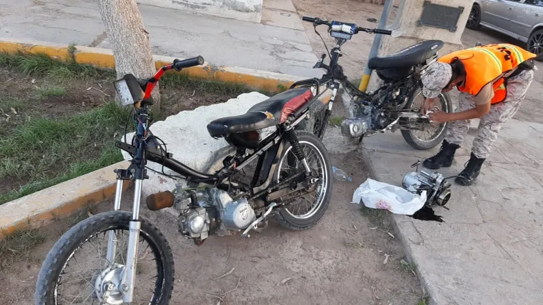 Las motocicletas carecían de documentación vigente y presentaban alteraciones en los números de identificación: una Zanella 110 c.c. sin carcaza con el número de cuadro limado; una Honda 110 c.c. con número de motor limado; y un motor de motocicleta Maverinck 110 c.c. sin documentación.
