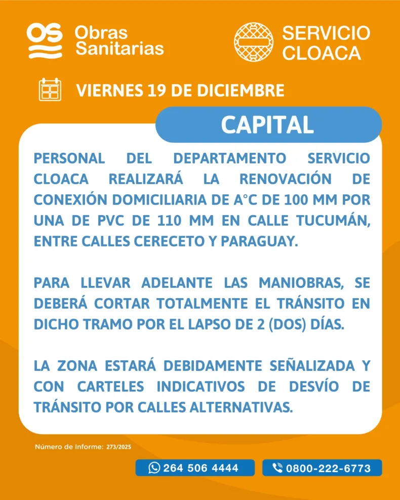 Obras Sanitarias informó que el viernes 19 de diciembre comenzarán trabajos de renovación de la conexión domiciliaria en calle Tucumán, entre Cereceto y Paraguay, en el departamento Capital. La antigua conexión de AC de 100 mm será reemplazada por una tubería de PVC de 110 mm.