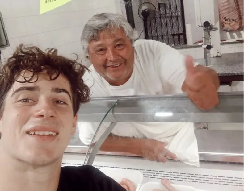 Las fotografías viralizadas lo muestran recorriendo la carnicería y posando en la puerta del comercio con una bolsa de compras y una chocolatada, reflejando su sencillez y cercanía con su público durante este momento de pausa en su carrera deportiva.
