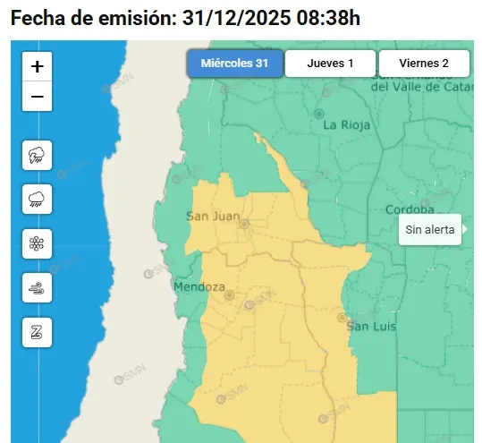 El Servicio Meteorológico Nacional prorrogó la alerta amarilla por tormentas para el miércoles 31 de diciembre de 2025 en la provincia de San Juan. Se esperan lluvias intensas, granizo y ráfagas de viento fuertes en varios departamentos.
