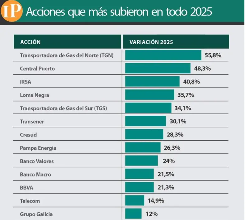 El año 2025 cerró con fuertes oscilaciones en los mercados financieros argentinos, impactados por el ciclo político y la incertidumbre electoral. El índice Merval registró un aumento del 20% anual, aunque quedó por debajo de la inflación estimada en más del 30%. Pese a esto, algunas acciones destacaron por su desempeño sobresaliente: Transportadora de Gas del Norte (TGN) ascendió un 56%, seguida de Central Puerto con un 48% y IRSA con un alza del 41%. También sobresalieron Loma Negra y Transportadora de Gas del Sur (TGS), con incrementos cercanos al 35%.
