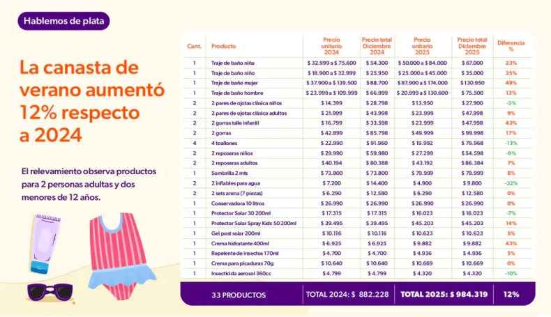 La Canasta de Verano 2026, integrada por 33 productos, alcanzó un valor total de $984.319, marcando un aumento interanual del 12% respecto al verano de 2025, cuando su costo era de $882.228.