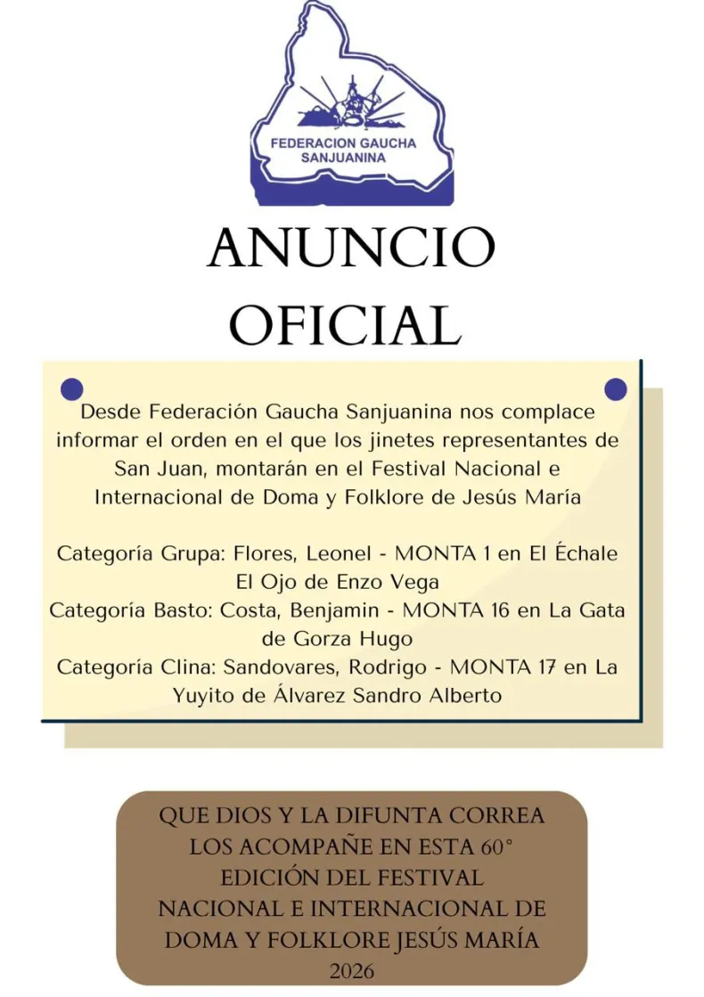 La Federación Gaucha Sanjuanina difundió oficialmente el orden de monta para los jinetes de San Juan que competirán esta noche en el Festival Nacional e Internacional de Doma y Folklore de Jesús María 2026, evento clave en la tradición gaucha del país.