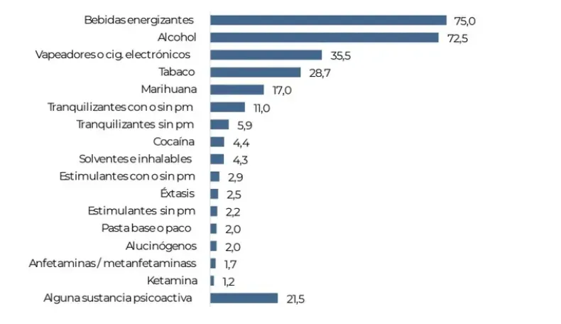 Según el informe, además del alcohol, las bebidas energizantes lideran el consumo entre los adolescentes, alcanzando una tasa del 75%, seguidas por el alcohol con un 72,5%. El uso de vapeadores o cigarrillos electrónicos presentó una prevalencia del 35,5%, superando el consumo de tabaco tradicional, que se registró en un 28,7%. Marihuana, tranquilizantes, cocaína, solventes e inhalables, entre otras sustancias, aparecen en menores porcentajes pero con subidas notables en algunas categorías.